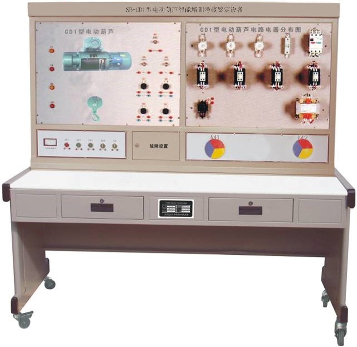 电动葫芦智能培训考核鉴定设备,是为各大、中专院校、职业学校的电气、自动化及相关专业、社会电工培训、各县市维修电工鉴定所(站)等单位电气控制内容的教学、考核而研制的,可用于课堂演示、机床电气控制原理性操作及实验实习。装置人为隐蔽地设置了几十项电路故障,学生借助原理分析,全方位真实的机床电气故障排除训练,是进行技能培训考核的理想设备,教学效果显著。