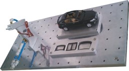 车窗涂胶装配模型:涂胶机、汽车模型、车窗工件板分别固定到操作台上;机器人通过吸盘夹具拾取车窗工件板上汽车车窗;并对拾取车窗进行涂胶,完成后把车窗装配到汽车上;而后拾取第二块车窗,依次完成前窗、天窗、后窗的拾取、涂胶、装配任务;练习对机器人点的示教、机器人运动轨迹选择及与涂胶机的配合。