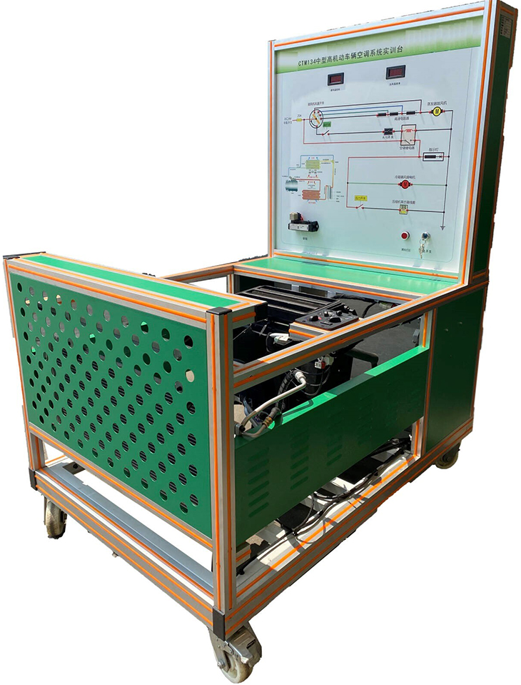 中型高机动车辆空调系统实训台、空调实训台采用新品空调系统的空调控制单元、控制面板、压缩机、压力开关、蒸发器、冷凝器、电磁风扇、各种电机等元件实物制作,实现  整车空调系统部件组成、工作原理的培训。实训台增加外部电源功能, 由电机驱动空调压缩机工作,操纵空调系统控制单元可实现空调电控部  分正常工作(如散热风扇、鼓风机、各风门电机等)。