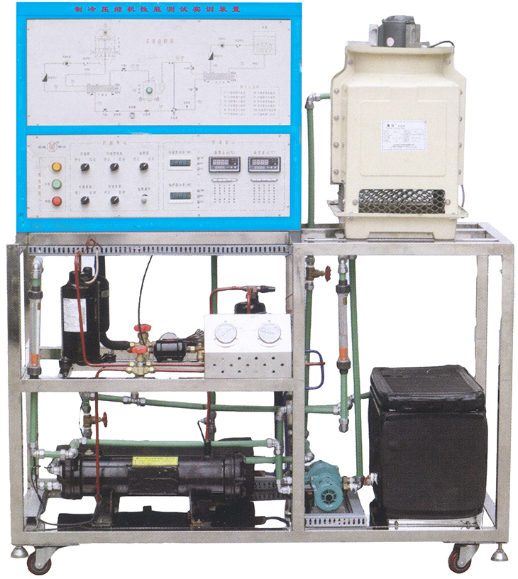 "制冷压缩机性能测试实训装置"采用蒸汽压缩式制冷循环系统,配备全封闭式制冷压缩机、冷凝器、蒸发器等制冷系统真实部件,并设有智能温度调节仪、流量计、压力表、电压表、电流表等测量仪表。不但能开设制冷压缩机性能参数的测定实训,还能进行制冷循环基本原理的演示实训。适用于职业院校制冷专业相关课程的教学实训。