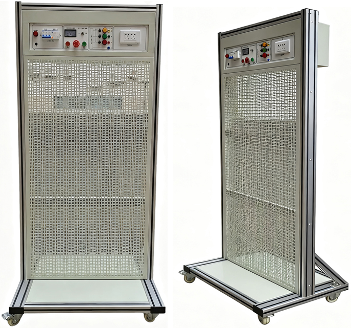 电气实训装置,属于职业教育或技能培训中用于电气安装、调试等实操训练的设备。采用铝型材框架,搭配镂空面板,底部有带轮底座便于移动;顶部设有控制区域,包含断路器、仪表、按钮、插座等电气元件,可模拟实际电气系统的控制与供电场景。
