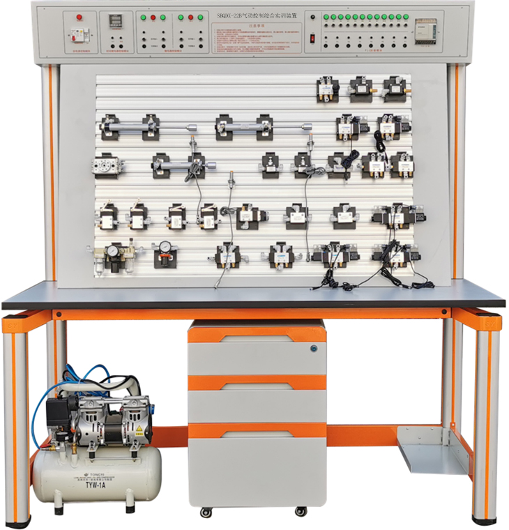 实验台由实验桌、实验操作区、网孔工具挂板、静音气泵、常用气动元件、主控机箱、电脑桌等几部分组成。