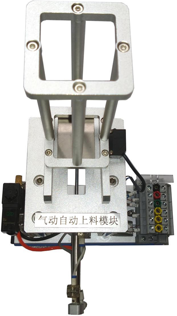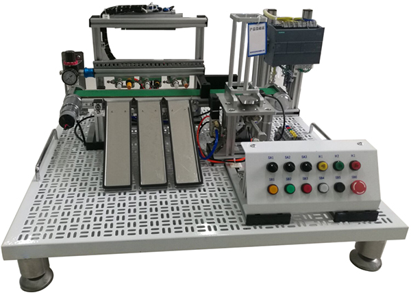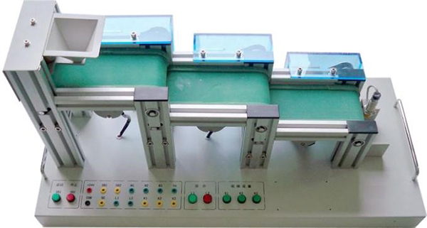 4)按钮模块采用型材底座,安装面板与桌面成45°夹角,包含急停按钮1只,旋钮开关3只,自锁带灯按钮黄、绿、红各1只,所有按钮和旋钮触点均引至端子接线排上;自动上料模块主体安装在工业型材上,结构由铝型材构成,方型工件库1件,物料推出机构1件,光电传感器,单缸气缸1只,主要完成将工件库中的工件依次推出;传输线模块主要包含直流电机1台,滚动轴承4只,滚轮2只,传输带1条,主要完成将工件输送到分拣区;物料检测及分拣模块主要包含气缸3个,电感传感器1只,电容传感器1只;漫反射式光电传感器1只,物料分拣槽3个,完成物料的分拣工作。调压阀主要安装在型材底座支架上,含有手滑阀可控制气路的通断和压力。辅助器件包含接线端子、物料、实训导线、气管等,模型控制所需的I/O点数与所配主机I/O点数相配套。气缸使用范围0.1-1MPa,工作温度-15-60℃,活塞带磁环可完成检测;光电传感器检测范围不小于1CM,输出电流80-200MA,防护等级IP65,输出方式NPN常开;传感器检测范围不小于1CM,输出电流80-200MA,防护等级IP65,输出方式NPN常开。