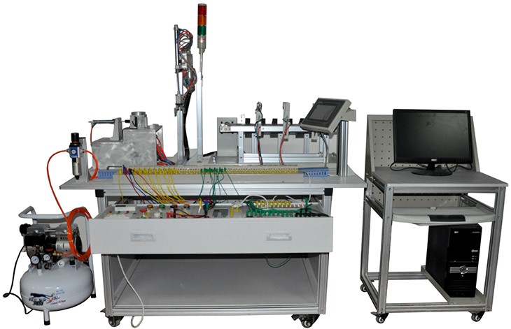 实训装置由由铝合金导轨式实训台、典型的机电一体化设备的机械部件、PLC模块、变频器模块、按钮模块、电源模块、模拟生产设备实训模块、接线端子排和各种传感器、计算机等组成。整体结构采用开放式和拆装式,实训装置用于机械部件组装,可根据现有的机械部件组装生产设备,也可添加机械部件组装其他生产设备,使整个装置能够灵活的按教学或竞赛要求组装具有生产功能的机电一体化设备。模块采用标准结构和抽屉式模块放置架,互换性强;同时还要求具有可拓展功能,可以组成更加大型的生产模拟系统,以配合各个用户学校不同层次,不同专业的教学及培训要求。