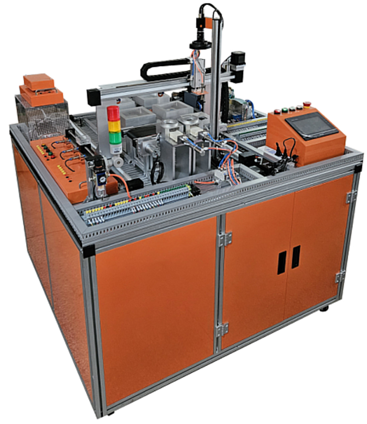 ★1、电气智能化系统安装技术实训装置,电气智能化系统安装技术实训台,电气智能化系统安装技术实训设备包括电气接线模块、上料模块、输送线模块、视觉识别模块、三维模组控制模块、称重模块、RFID产品溯源模块、物料摆放模块、小车运动控制模块、温控箱变频控温模块。提供符合上述要求的装置整体设计效果图。