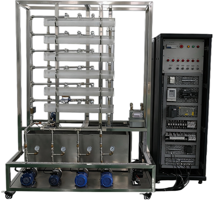 供水模型全部使用不锈钢和有机玻璃器件,保证不生锈、不易老化;模拟六层大楼给水系统,具有有生活水系统和消防水系统两种水路模型;动力系统由四台水泵构成,其中两台常规变频循环泵,一台休眠小泵,一台消防泵,能够模拟常规生活供水系统、消防供水系统和夜间小流量供水系统,能生动模拟大楼给排水系统的典型结构