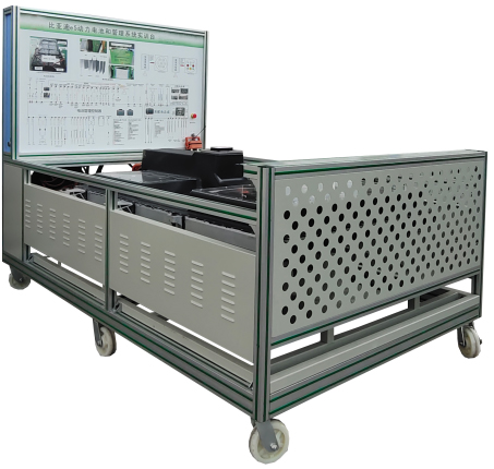 (比亚迪e5 EV300纯电动汽车) 锂动力电池组、电池管理系统BMSBMS显示屏(7寸触摸屏)、维修开关、辅助蓄电池(12V45AH)、高压配电箱、漏电传感器、车载充电机、国标充电插座与充电枪、直流接触器(包含充电继电器、总正继电器、总负继电器、预充继电器)、急停开关与电源总开关、一体化全铝合金型材搭建的移动台架(1500×700×1700mm ,带自锁脚轮装置,带安装检测端子的原理面板1448×940mm)、故障考核系统、设备操作说明书。
