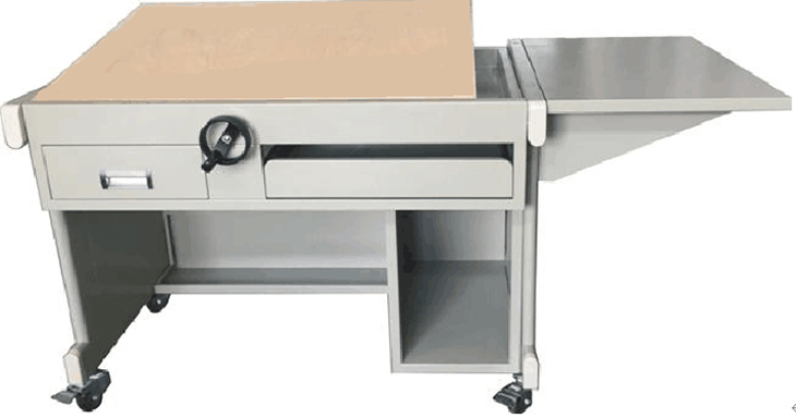 2.桌面采用方型升降架,金属方框架不和图板连接,上面可以放置1号或者2号椴木绘图板,兼顾课堂教学和制图作业的双重连续性和多款性;