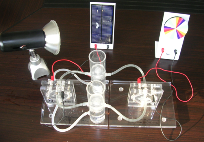 燃料电池教具是利用光线照射在太阳能电池板上产生电能,然后利用产生的电能作用在电解电池模块上,使水发生电解产生氢气和氧气。氢气和氧气进入到发电模块产生电能,带动风扇转动。
