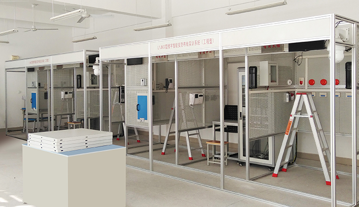 由铝合金型材框架和安装布线网孔板组成3120mm×1580mm×2310mm(长×宽×高),分为智能大楼(小区)、管理中心,器件采用自攻螺丝和工程塑料卡件配合安装。 |