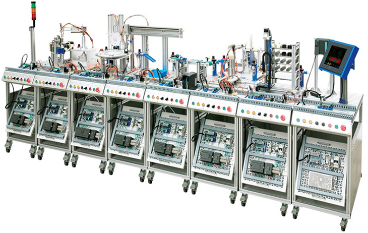 模块化柔性生产线实训系统(八站)MPS网络型模块式柔性自动化生产线实训系统是一种最为典型的机电一体化、自动化类产品,它是为职业院校、教育培训机构等而研制的,它适合机械制造及其自动化、机电一体化、电气工程及自动化、控制工程、测控技术、计算机控制、自动控制等相关专业的教学和培训。它接近工业生产制造现场基础上又针对实训教学进行了专门设计,强化了各种控制和工程实践能力。采用了先进的总线控制方式,增配有主控PLC、工业触摸屏、MCGS工业组态监控软件等,系统更加完整性,更能展现工业现场的工作状态及现代制造工业的发展方向。
