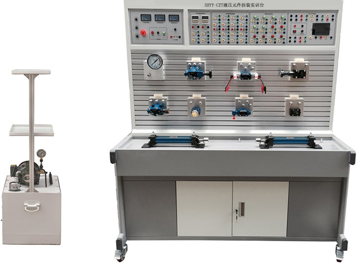 集真实的液压元件、各执行模块、继电器控制单元、PLC编程控制技术于一体,液压元件成独立模块,均装有带弹性插脚的底板,实训时可在通用铝型材板上组装成各种液压系统回路,电机和泵轴承式连接(一体化)再和油箱固定在一起,油箱和控制屏单独放置;带有三相电源漏电保护,直流电源带有过流保护,系统额定压力为6.3Mpa。