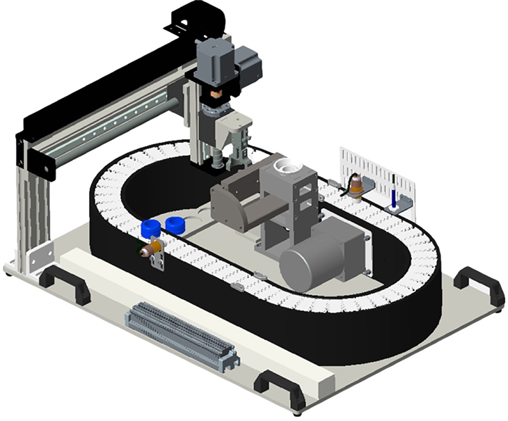 4.环形传送分拣任务模型模型底板由8mm厚铝板加工氧化而成,装有四个黑色铸铝拉手,方便搬运。底板上方有环形输送带、气动机械手、搬运龙门架、分拣机构、变频电机、伺服电机、步进电机、多种传感器及气缸等组成。该任务模拟生产线自动化控制,变频器控制输送带电机实现调速功能;通过光纤、光电、金属、RFID等多种传感器检测,PLC控制伺服、步进、多种气缸动作完成上料、分拣、搬运等多种功能。同时为方便教学,端口采用全开放设计。