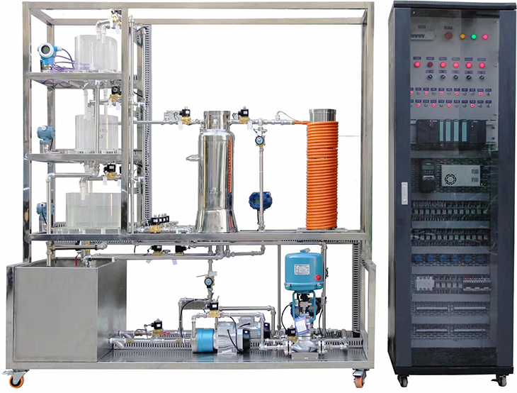 实验对象系统包含有:不锈钢储水箱;上、中、下三个串接有机玻璃圆筒型水箱;三相4.5kW电加热锅炉(由不锈钢锅炉内胆加温筒和封闭式外循环不锈钢冷却锅炉夹套构成)和铝塑盘管组成。