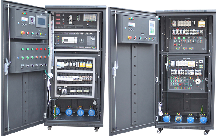 电工实训考核装置装置可完成"电工技术""工厂电气控制""机床线路控制""可编程控制技术"等多门课程的实训。装置资源开放,可充分培养学生的实际动手能力,适合当今教育教学中的实训训练。本装置采用用标准配电柜为主体柜、双面结构,包含如下资源:电源控制、三相交流电源,直流电源,励磁电源、电枢电源、测量仪表、可编程控制器(三菱系列)、模拟量模块、编码器、彩色触摸屏、变频器(三菱系列)、控制软件、交流接触器、按钮、指示灯、时间继电器、行程开关、中间继电器、三相异步电机、直流电机,机床智能考核等。适用于大学、专科院校及各类职业教育培训机构的实训教学、考核鉴定。