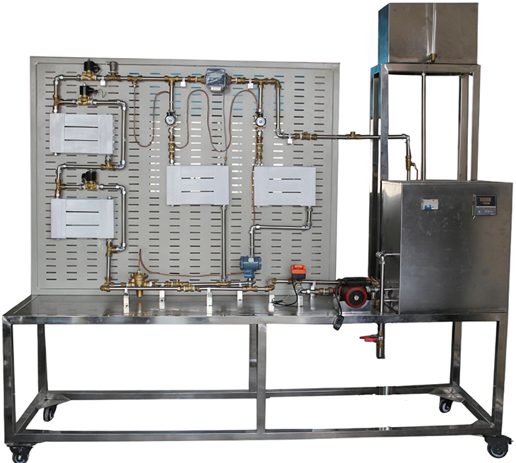 供热系统管道安装实训台采用不锈钢框架及钢制网孔板结构,造型美观大方,安装器件方便,在实训台上安装万向轮,方便实训台的移动。