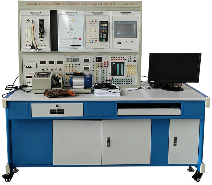 实训装置由控制屏、实训桌、主机实训组件、实训模块(含丰富的工业现场设备模拟实训对象)、变频器挂箱、触摸屏挂箱、交直流电机、总线单元、等组成。