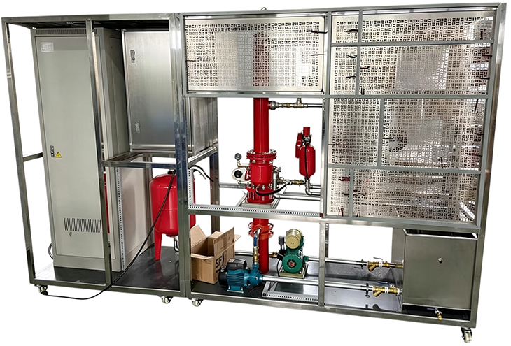 模型框架和水箱等主要部件全部使用不锈钢器件,保证不生锈、不易老化,模拟两层大楼喷淋灭火系统;模型系统主要由喷淋水泵、气压罐、湿式报警阀、水力警铃、延时器、压力开关、水流指示器、封闭式喷头、试验阀、火灾探测器、火灾报警器等典型喷水灭火设备构成,能生动模拟大楼内水灭火系统的典型结构。