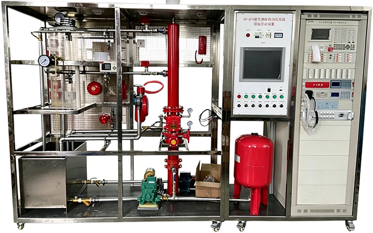 楼宇消防自动化系统综合实训装置、消防联动控制中心及喷淋灭火系统实训装置”依据[建筑消防设计规范]进行标准设计该系统具有消防控制联动中心、消防广播电话中心、消防喷水灭火系统典型结构,能够完成火灾探测,早期探测,火灾报警,现场灭火,气体灭火等演示性实训项目和消防管理中心,同时还能清楚的展示喷淋灭火系统的典型设备构成和系统工作原理,通过该装置的操作学习,学生可以对楼宇中喷水灭火系统的结构有一个全面的了解,喷淋系统与联动动控制中心系统实现联网控制,探测器与联动中心联接实现手自动控制,同时与广播电话中心联网,完全实现现智能化大楼设计,掌握建筑物内部主要灭火设备的应用,熟悉楼宇中湿式报警阀、水流指示器、压力开关等灭火设备的结构和原理,了解消防控制中心的联动操作与设置,广播电话中心的控制与操作设置,了解现代建筑消防联动设备系统原理和调试,熟悉消防的控制原理和工作过程。它适用于学习《建筑灭火系统》、《楼宇给排水系统》、《楼宇消防控制系统》等专业课的中职业院校的实训教学。