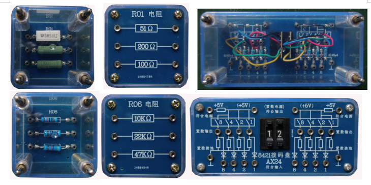提供电工电子透明实训模块,可以完成直流电路、模拟电子技术、数字电子技术和电子综合应用实训项目。实训模块面板采用PCB板制作而成,器件和信号接口均已引至板上的专用插座,实训模块有四个弹性插脚,与专用实训孔板配套使用。