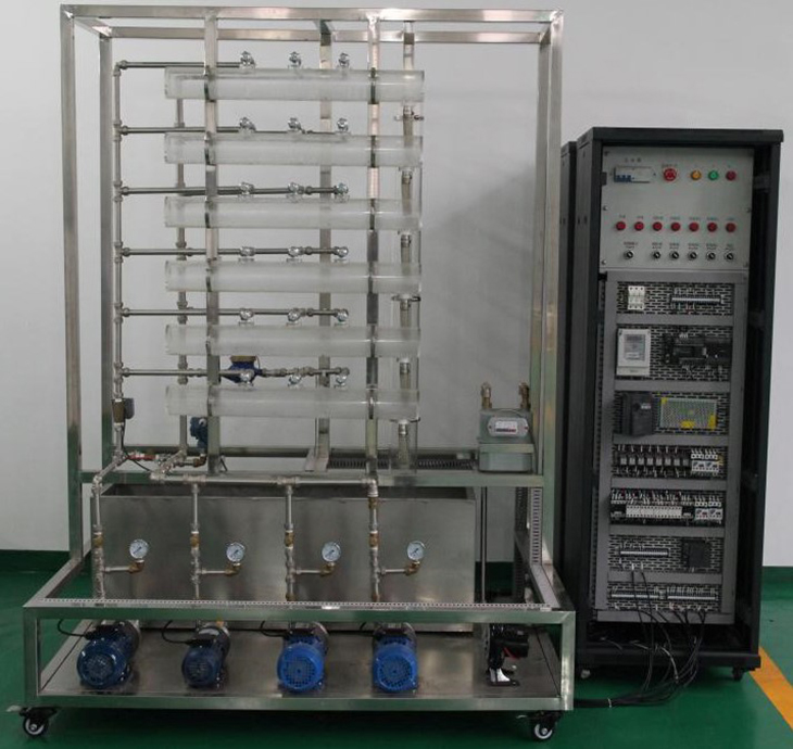 供水模型全部使用不锈钢和有机玻璃器件,保证不生锈、不易老化;模拟六层大楼给水系统,具有有生活水系统和消防水系统两种水路模型;动力系统由四台水泵构成,其中两台常规变频循环泵,一台休眠小泵,一台消防泵,能够模拟常规生活供水系统、消防供水系统和夜间小流量供水系统,能生动模拟大楼给排水系统的典型结构