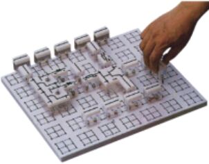),九孔万能插件板主体由ABS注塑而成,表面布有九孔成一组相互联通的插孔,九孔万能插件板内部内嵌126组铜质九孔一体成型嵌件(共有1134孔)。实验中的弱电模块必须以独立封装的透明元件盒为单一模块,元件盒统一都能配合九孔万能插件板像搭积木一样的形式自由搭建组合电路;元件盒盒体透明,内装元件直观性好,盒盖印刷电路图防刮耐磨,符号美观清晰。元件盒盒体与盒盖采用较科学的压卡式结构,维修拆装方便。每张台桌配有一粒胶皮板,保护通用底板与桌面(如需在桌上放置电动机、焊接等)。